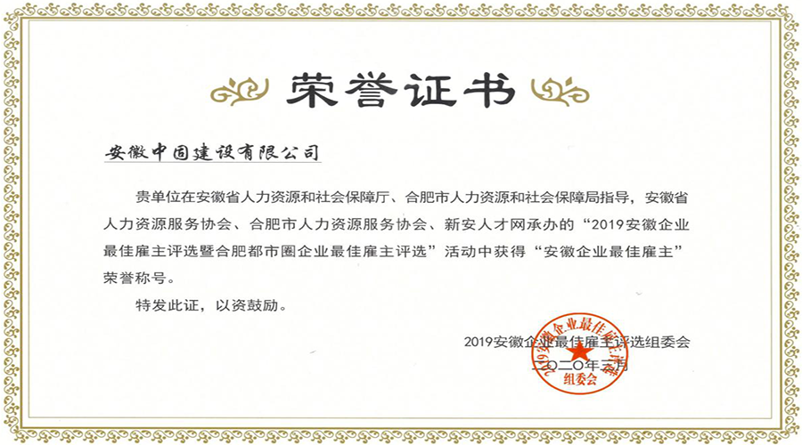 近日,由安徽省人力資源和社會保障廳、合肥市人力資源和社會保障局指導,安徽省人力資源服務協(xié)會、合肥市人力資源服務協(xié)會、新安人才網(wǎng)承辦的“2019安徽企業(yè)最佳雇主評選暨合肥都市圈企業(yè)最佳雇主評選”活動中,安徽中固建設(shè)有限公司榮獲“安徽企業(yè)最佳雇主”榮譽稱號。