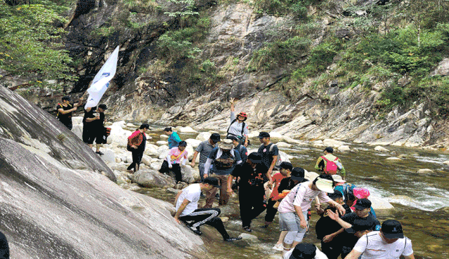 山河遠(yuǎn)闊,自然值得一探究竟。根據(jù)村民們的指引,大家最后一站來到了龍井峽。峽谷內(nèi)瀑布成群,怪石遍地,對我們來說又是一次巨大的挑戰(zhàn)。從入口處下車,步入林蔭山道,山邊小路苔蘚密布,大家小心翼翼地一步步前行。近三十分鐘的路程后,來到了龍井河下游的第一個(gè)瀑布龍井瀑,人尚未走近,奔騰的水霧撲面而來,約五十米高如柱的水流從天而降,直泄瀑底的龍井潭。大家被自然的景觀深深折服。