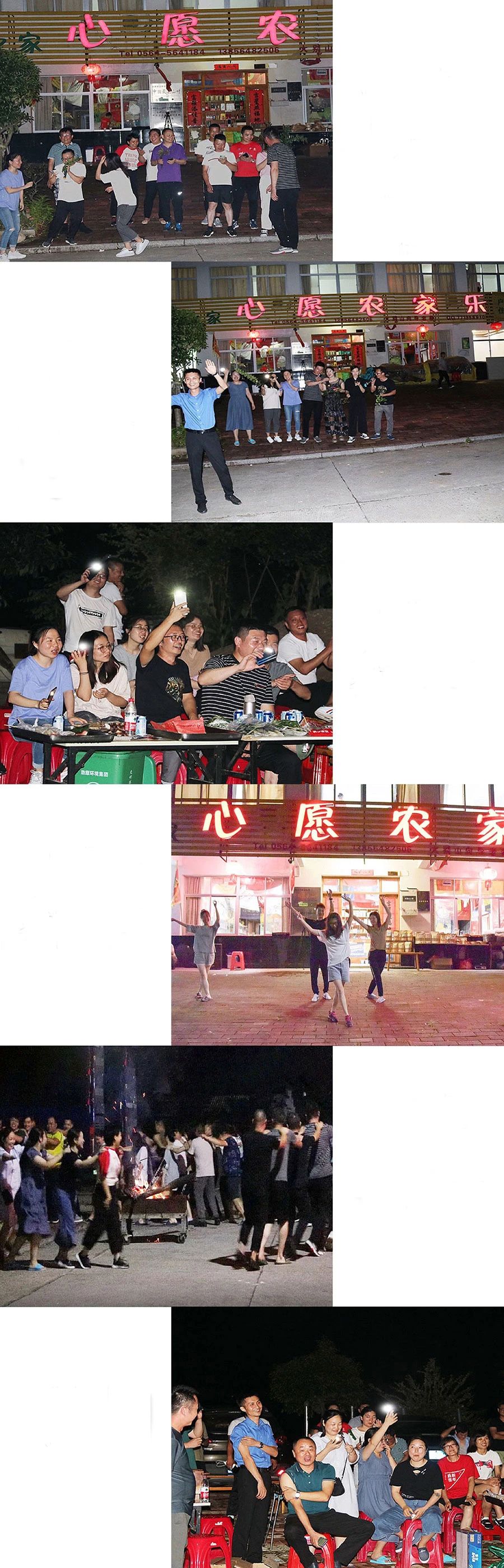 夜晚,當(dāng)絢爛的煙火劃過天際,當(dāng)篝火在寧靜的山村熊熊燃起,當(dāng)燒烤的香氣逐漸彌漫,簡單而又豐富的活動(dòng)按時(shí)登場了。一首動(dòng)感十足的野狼disco開啟了晚會(huì)的序曲,集團(tuán)常務(wù)副總裁徐華龍給大家?guī)砹恕赌愕臉幼印?,?cái)務(wù)部的小伙伴們讓大家領(lǐng)略了《大別山下的白素貞》,黨員同志們演唱了《我和我的祖國》,裝飾公司為大家獻(xiàn)上了《相親相愛一家人》……壓軸的《兔子舞》將演出推向了高潮。此時(shí),沒有了徒步時(shí)的疲憊,也沒有了工作時(shí)的壓力,大家在一起共同交流,放松身心。