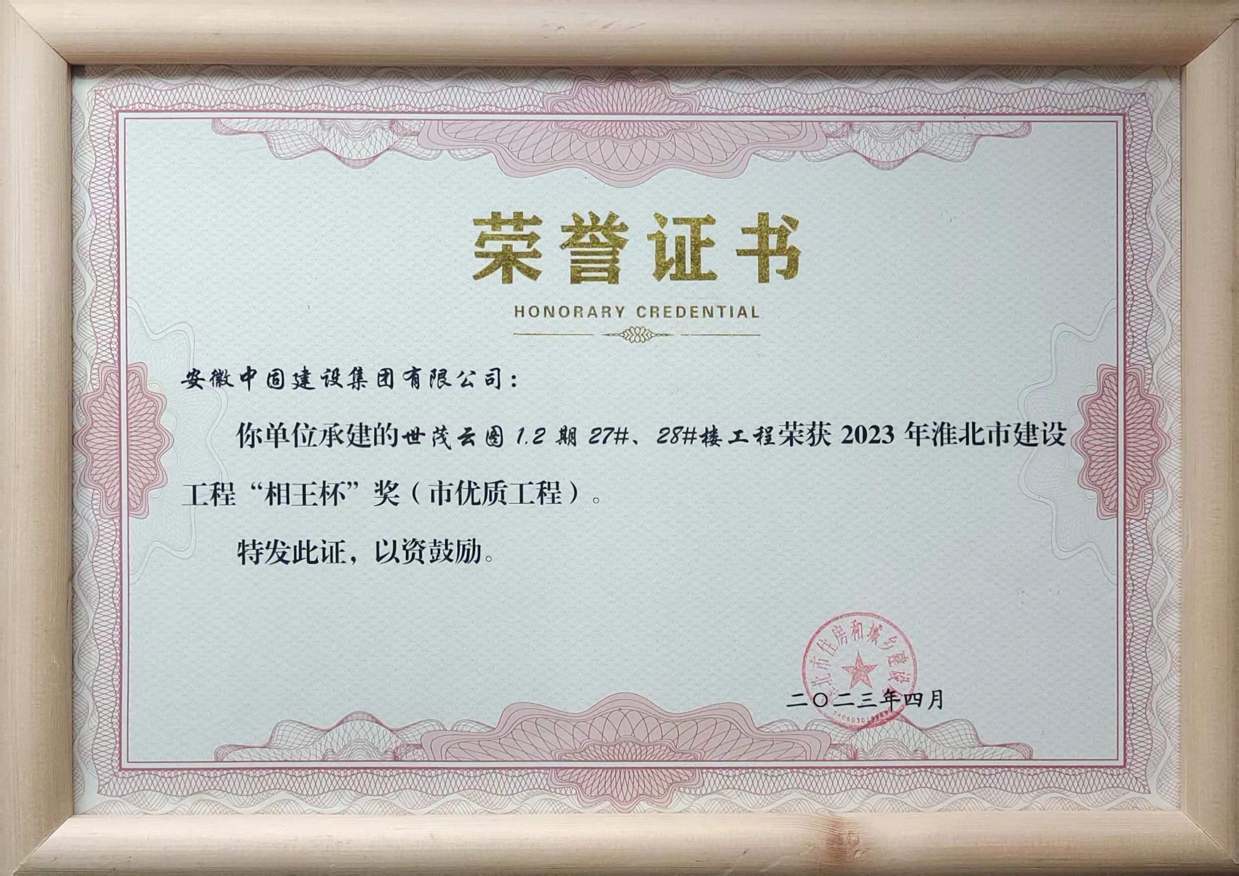 世茂云圖1.2期27#、28#樓工程榮獲“2023年淮北市建設(shè)工程'相王杯'獎(jiǎng)(市優(yōu)質(zhì)工程)”