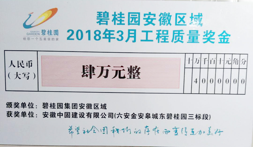 2018年4月9日,中固建設(shè)六安金安皋城東碧桂園三標(biāo)段項(xiàng)目部發(fā)來(lái)捷報(bào),公司榮獲“碧桂園集團(tuán)安徽區(qū)域六安金安皋城東碧桂園三標(biāo)段工程質(zhì)量第三名”,并獲得4萬(wàn)元獎(jiǎng)金嘉獎(jiǎng)。據(jù)悉,該項(xiàng)目連續(xù)五個(gè)月來(lái)在碧桂園集團(tuán)區(qū)域檢查中均排在前列,更為難得的是取得了2017年度工程質(zhì)量一等獎(jiǎng)的好成績(jī)。