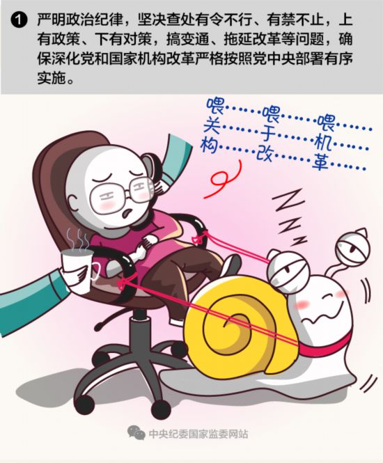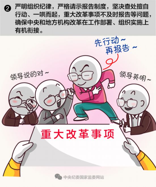中國共產(chǎn)黨新聞網(wǎng)北京4月8日電 (記者李源)中央紀(jì)委國家監(jiān)委網(wǎng)站“一定之規(guī)”欄目近日發(fā)布一組警示漫畫,揭露了深化機(jī)構(gòu)改革中可能存在的六類違紀(jì)問題,具體內(nèi)容如下: