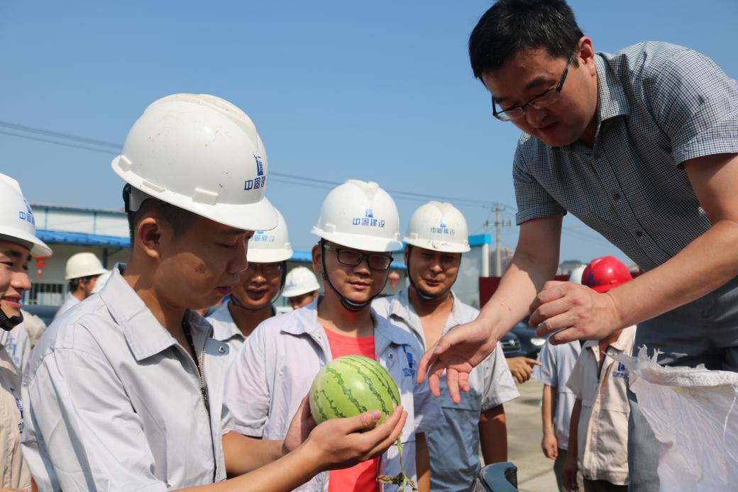 慰問過后,縣住建局領(lǐng)導(dǎo)頂著烈日爬上貨車為工友們搬西瓜、搬礦泉水,整箱整箱的水帶給他們的是炎炎夏日里最濃厚的情誼,溫潤了他們的心房。慰問組一邊遞給他們物品一邊叮囑我們:高溫天氣一定要注意防暑降溫,注意關(guān)愛工友。在隨后召開的座談會上,慰問組對高溫天氣施工提出了幾點要求和建議。要求項目部做好防暑降溫的各項準(zhǔn)備工作,定期給崗位人員安排體檢,嚴(yán)禁患有高血壓心臟病的人群進(jìn)入施工現(xiàn)場等。