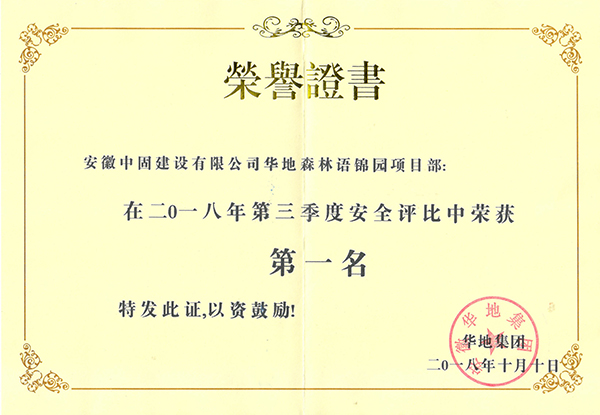 近日,安徽中固建設(shè)有限公司?華地森林語錦園項目以總分96.4分的高分,榮獲華地集團(tuán)2018年三季度“安全競賽評比活動”第一名。