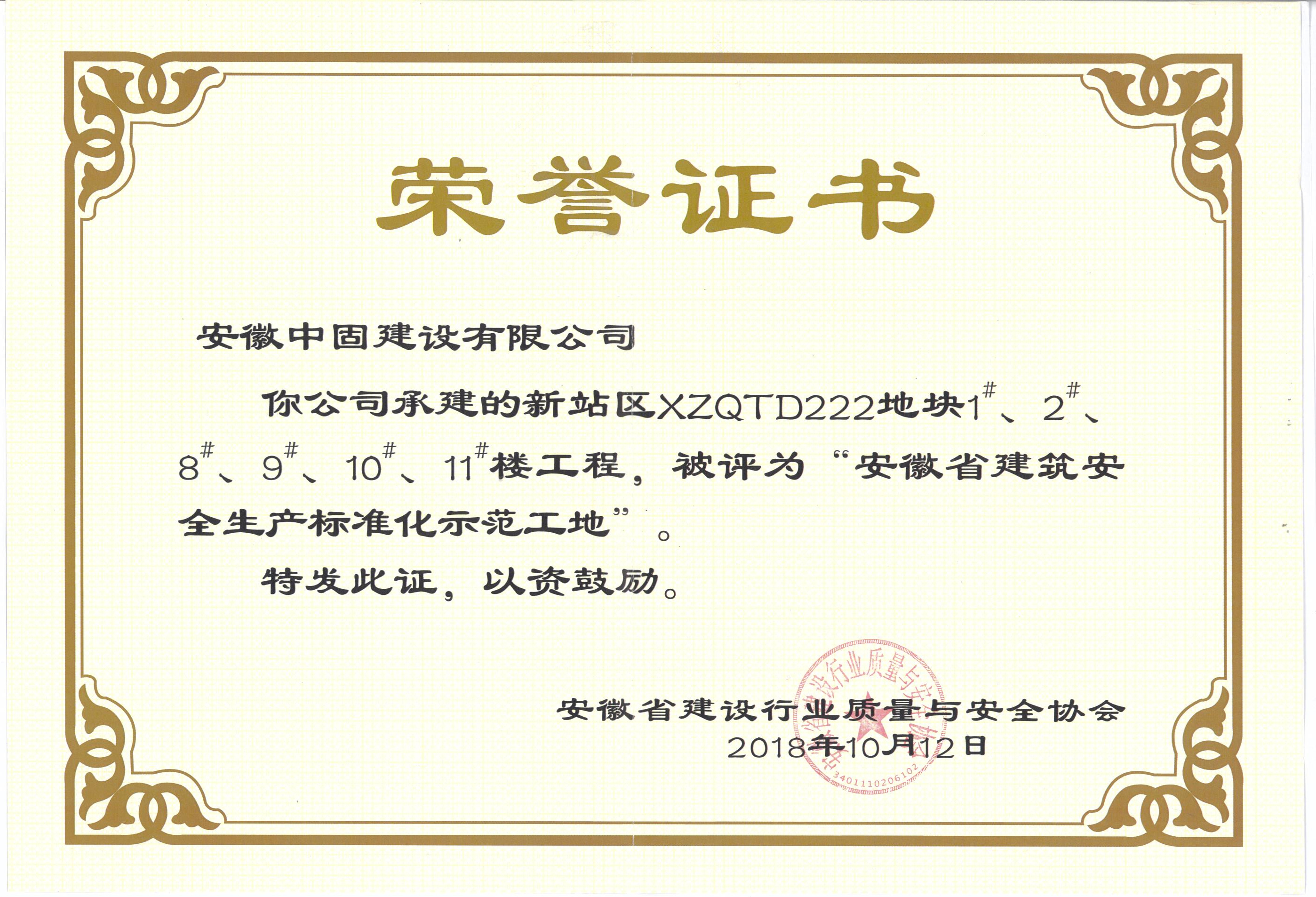 11月29日,我司承建的新站區(qū)XZQTD222地塊1#、2#、8#、9#、10#、11#樓工程(皖投萬科天下藝境項目),獲頒“安徽省建筑安全生產(chǎn)標準化示范工地”證書及獎牌。